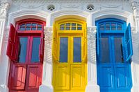 Koloniale deuren in rood, geel en blauw en ornamenten aan de bovenkant. Deze foto is gemaakt in een oude koloniale wijk in Singapore.