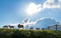 Een moeder schaap houdt haar lammeren in de gaten op de dijk.