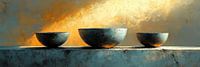 Kommen | Shadows and Light - Dit stilleven schilderij toont drie rustieke, donkergrijze kommen op een ruwe, lichtgrijze ondergrond, badend in een warm, goudgeel licht dat een gevoel van kalmte en eenvoud uitstraalt.