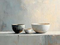 Kommen - Dit stilleven schilderij toont drie rustieke kommen in verschillende groottes, geplaatst op een lichtgekleurde houten plank tegen een zachttintige achtergrond.