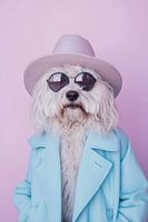 Met een nonchalante, hemelsblauwe jas en een slimme zonnebril straalt deze Komondor ongegeneerde charme uit. Zijn snode dreads zien eruit als een koninklijke manen, terwijl de elegante hoed een vleugje verfijning toevoegt. Samen creëren ze een beeld van stijlvolle speelsheid dat harten verovert.