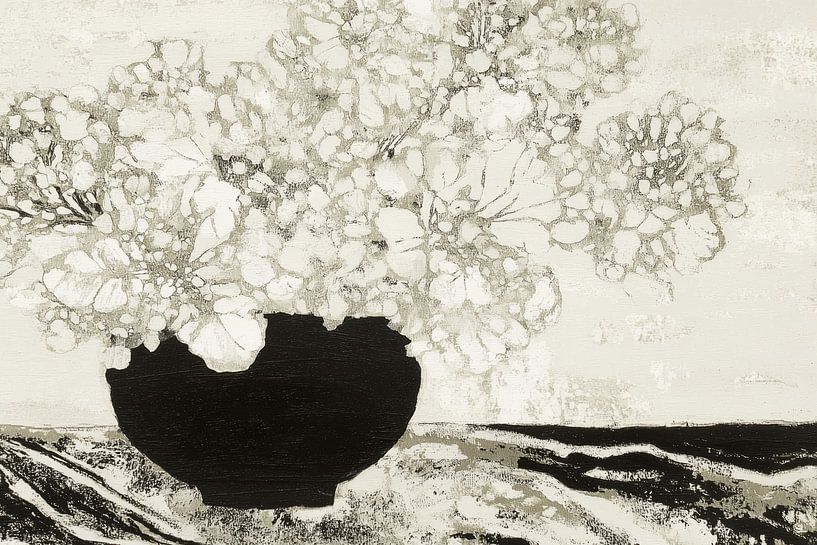 Een horizontale compositie met een donkere, silhouetachtige schaalvaas gevuld met delicate, gestippelde witte bloemen. De tafel en achtergrond hebben zachte, verweerde texturen in tinten gebroken wit en antraciet.