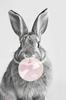 Een schattig grijs konijn blaast een grote roze kauwgombel voor een witte achtergrond. Interessante en humoristische scène.