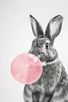 Een schattig grijs konijn blaast een grote roze kauwgombel voor een witte achtergrond. Interessante en humoristische scène.