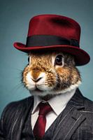 Dit unieke en opvallende ontwerp toont een elegant konijn in een strak pak en een stijlvolle rode hoed. De mix van een dier in menselijke kleding geeft het beeld een surrealistisch en speels karakter. Perfect voor een kantoor of een moderne slaapkamer, waar het zeker een gespreksonderwerp zal zijn. Het contrast tussen de zachte vacht van het konijn en de strakke lijnen van het pak zorgt voor een dynamisch visueel effect. Een ideale keuze voor liefhebbers van originele en opvallende kunstwerken die een ruimte iets bijzonders willen geven.