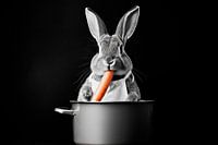Een ondeugend chef-konijntje dat poseert met een knapperige wortel in de pan brengt vrolijkheid en humor in elke keuken. Het opvallende contrast tussen het helderwitte dier en het effen zwart zorgt voor een opvallend element dat de perfecte gespreksstarter is en van koken een leuke ervaring maakt!
