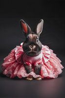 Dit is een digitaal beeld van een klein konijn dat een roze prinsessenjurk met kant draagt. Het konijntje kijkt recht in de lens