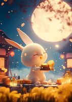 Het konijn, centraal geplaatst, houdt een dienblad met goudkleurige maancakes vast. Zijn uitdrukking is vriendelijk en vrolijk, met grote, expressieve ogen en…