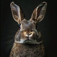 De warme en natuurlijke kleurtinten van het konijn variërend van zachtbruin en beige tot subtiel grijs komen prachtig naar voren tegen de diepe donkere achtergrond. Dit sterke contrast geeft het portret extra diepte en laat het dier visueel naar voren treden, alsof het elk moment tot leven kan komen. Het spel van licht en schaduw voegt bovendien een verfijnde gelaagdheid toe aan het beeld.