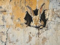 Konijn - Dit dieren schilderij toont een nieuwsgierige konijn dat voorzichtig zijn hoofd door een gat in een verweerde muur steekt, omringd door afbladderende geelachtige verf.