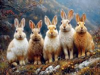Een groep konijnen die niet helemaal serieus genomen moet worden. Een grappige muurschildering als humoristische decoratieve kunst voor een stijlvol interieur.
