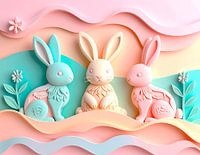 Drie schattige pastelkleurige konijntjes in zachte groen, geel en roze kleuren. Doordat ze van zeep zijn gemaakt stralen ze zachtheid uit. Het beeld is met behulp van ai gegenereerd.