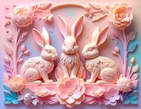Een 3-D schilderij van drie roze konijnen. De konijntjes zitten tussen de roze bloemen en het geheel is gemaakt van zeep waardoor het zacht en heerlijk geurend is. Het beeld is met behulp van ai gegenereerd.