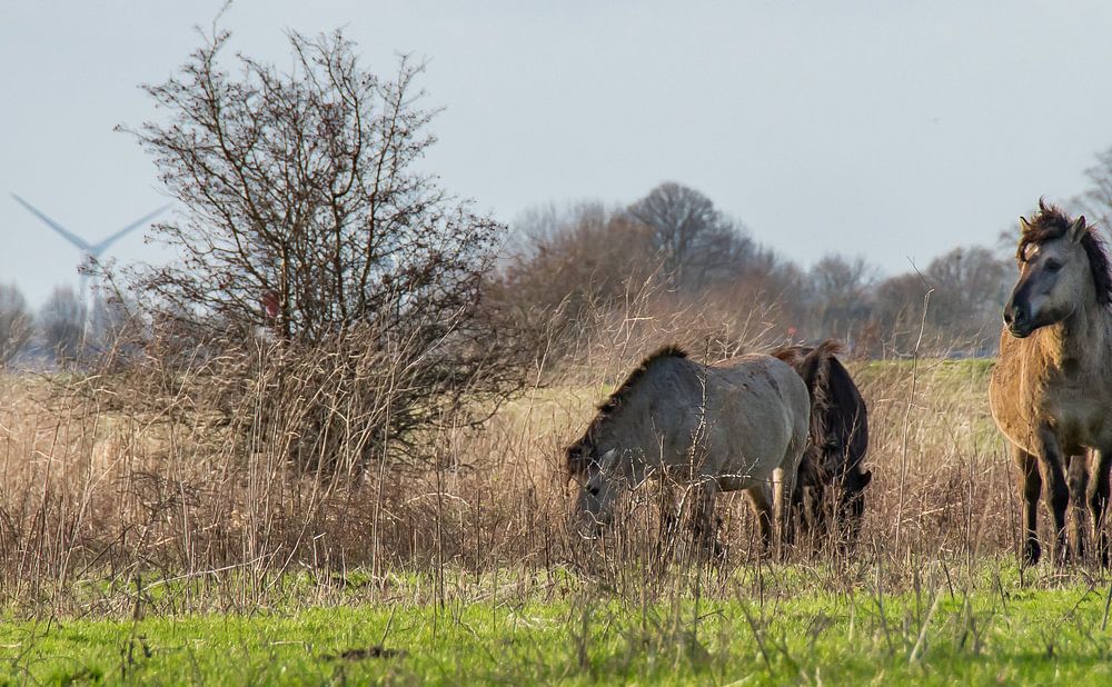 Deze paarden zijn half wild en grazen in de Blaauwe kamer. je kunt er vrij dicht bij komen, de paarden lijken gewend aan wandelaars. Toch heb ik eerbied voor zo'n grote kudden en wil ze niet storen. Met een zoom lens kun je ze toch goed fotograferen.
