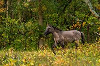 Plots verschijnt hij — een Konikspaard, krachtig en vrij, alsof hij uit het schilderij stapt. Vanuit het bos, omgeven door de warme kleuren van de herfst, beweegt hij door het landschap met een natuurlijke gratie. Een toevallige ontmoeting, gevangen in een moment van stilte en verwondering. Deze foto ademt de magie van het seizoen en de schoonheid van het onverwachte. Perfect als wanddecoratie voor liefhebbers van wilde paarden, herfstlicht en de pracht van de natuur.