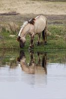 Dit Konikpaard zoekt een plasje op in de Kennemerduinen om te drinken. Nationaal Park Zuid-Kennemerland
