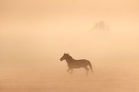 Konikpaarden in de mist op een mooie mistige lente ochtend in het nationaal park Lauwersmeer in Groningen tijdens zonsopkomst in mei.