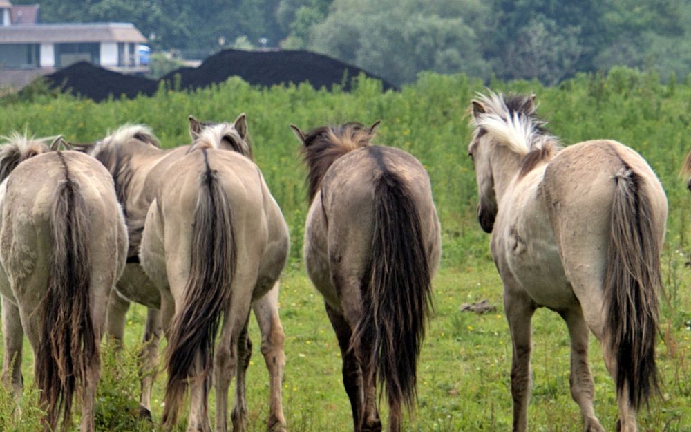 Netjes in een rij wilden ze het toneel verlaten. Alsof het was afgesproken. Deze prachtige Konikpaarden kwam ik tegen in de omgeving van slot Loevestein waar ze een heel mooi gebied tot hun beschikking hebben.
