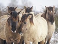 Konikpaarden in de sneeuw in natuurgebied Lentevreugd. Er lopen hier ongeveer 20 van deze paarden. Van de konik wordt vaak gezegd dat hij verwant is aan de tarpan, een uitgestorven wild paard uit Oost-Europa. Evenals vele andere oorspronkelijke paardenrassen is de konik klein (ponymaat) en toont zijn vacht kenmerken van het…