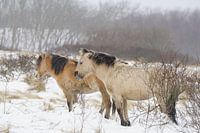 Konikpaarden in de sneeuw in natuurgebied Lentevreugd. Er lopen hier ongeveer 20 van deze paarden. Van de konik wordt vaak gezegd dat hij verwant is aan de tarpan, een uitgestorven wild paard uit Oost-Europa. Evenals vele andere oorspronkelijke paardenrassen is de konik klein (ponymaat) en toont zijn vacht kenmerken van het…