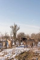 Een kudde Konik paarden, wilde paarden, in de sneeuw in natuurgebied Slikken van de Heen in de provincie Zeeland in Nederland. Het gebied wordt beheerd door Stichting Het Zeeuwse Landschap.