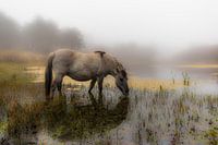 Een mistige ochtend met de zon die net pas begint door te breken. Koniks paard drinkt en eet in een drassig gedeelte van de duinen.