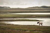 Vanuit uitkijkpunt het Diepe Gat op Texel kijk je op zee uit. Tegen zonsondergang kwamen enkele konikspaarden aanlopen. Het landschap lijkt desolaat en doet aan IJsland denken.