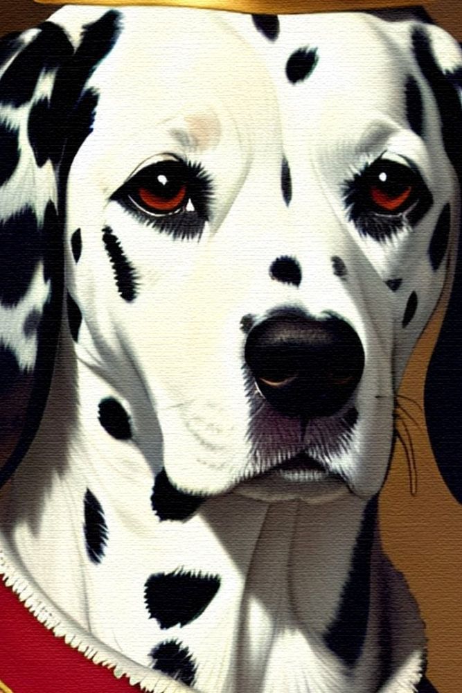 Deze prachtige wit met zwart gevlekte hond heeft een adellijke uitstraling door de kroon en het gewaad dat hij draagt maar ook door de manier waarop hij poseert.