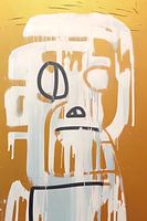 Deze afbeelding toont een modern abstract kunstwerk met een minimalistisch figuur tegen een levendig oranje-gele achtergrond. Het kunstwerk gebruikt een beperkt kleurenpalet, bestaande uit witte, beige en zwarte tinten, waardoor een contrasterend en gedurfd visueel effect ontstaat. De figuur lijkt een gestileerde, mensachtige vorm te hebben met een nadruk op de contouren van het gezicht. De ruwe, bijna druipende verfstreken geven het werk een gevoel van beweging en textuur, terwijl de grote, open ogen en de simplistische mond een expressie van verwondering of bezorgdheid suggereren. Dit stuk zou passen in een moderne of eigentijdse ruimte en spreekt liefhebbers van abstracte, expressieve kunst aan.