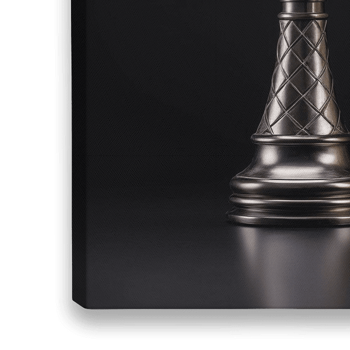 De compositie is strak en stijlvol, waarbij elk element zorgvuldig is vormgegeven om kracht en verfijning te combineren. Het goud symboliseert macht en overwinning, terwijl het zilver staat voor wijsheid en kalmte. Samen vormen ze een visuele metafoor voor samenwerking en evenwicht – essentieel in zowel het spel als het leven. De glans van de stukken lijkt te veranderen met het licht, wat het schilderij een dynamische en bijna driedimensionale uitstraling geeft.