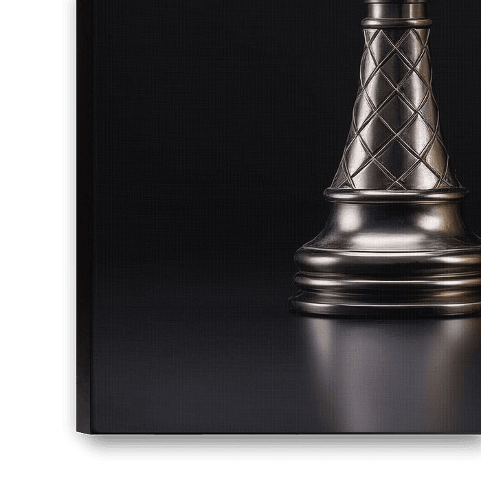 De compositie is strak en stijlvol, waarbij elk element zorgvuldig is vormgegeven om kracht en verfijning te combineren. Het goud symboliseert macht en overwinning, terwijl het zilver staat voor wijsheid en kalmte. Samen vormen ze een visuele metafoor voor samenwerking en evenwicht – essentieel in zowel het spel als het leven. De glans van de stukken lijkt te veranderen met het licht, wat het schilderij een dynamische en bijna driedimensionale uitstraling geeft.