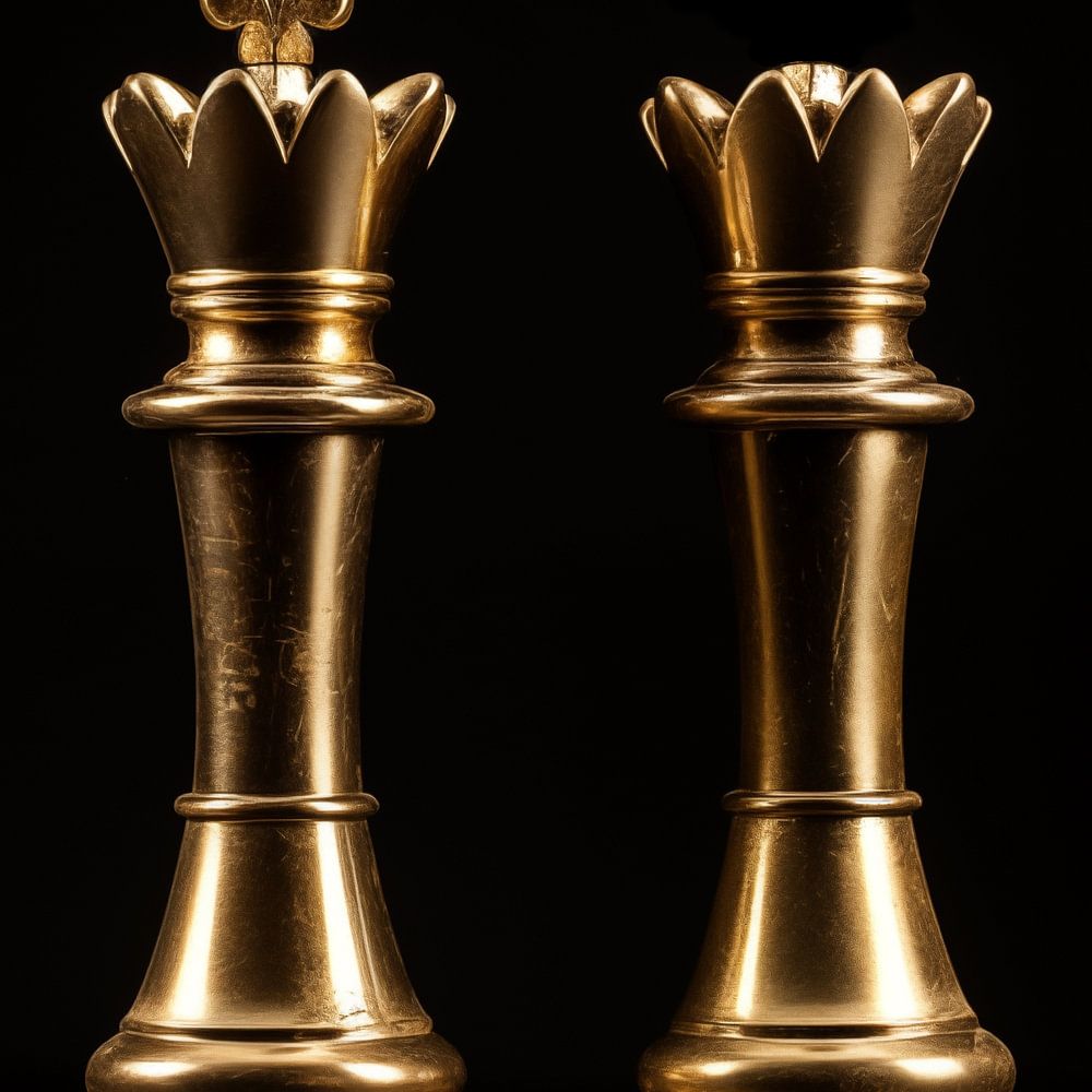 Unieke koning en koningin schaakstuk goud schilderij met een originele stijl. Met prachtige kleurtinten en een uniek ontwerp maakt dit tot een stijlvolle fotoprint die prachtig staat in elke ruimte.