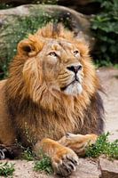 Koning leeuw in een halve draai, kop en poten , Aziatische Indiase leeuw op een achtergrond van stenen