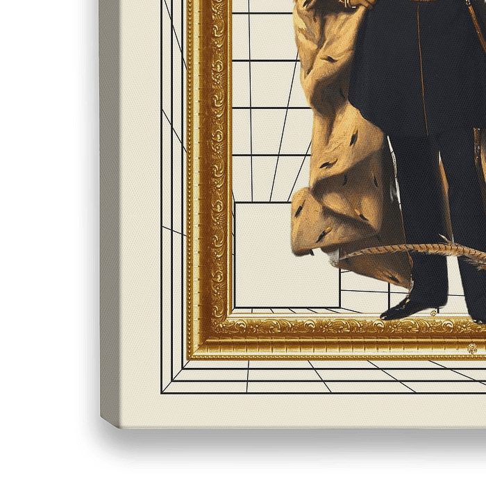 Koning stapt uit zijn lijst; deze koning uit het verleden lijkt geteleporteerd via de matrix in een raster naar deze tijd.
