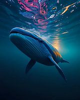 Een indrukwekkende walvis zwemt majestueus door het diepblauwe water van de oceaan terwijl de zon langzaam ondergaat aan de horizon. De lucht is gevuld met een adembenemend kleurenspel in warme tinten oranje, roze en paars, dat op creatieve wijze wordt weerspiegeld in het water. De zachte golven deinen harmonieus als de walvis in zijn volle pracht het wateroppervlak doorbreekt. Zijn enorme lichaam glinstert in het licht van de ondergaande zon en verandert in een sierlijk silhouet tegen de stralende achtergrond.