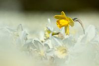 Een fris bloeiende gele narcis steekt de kop boven het maaiveld uit in het midden van witte soortgenoten. Het is voorjaar. De bloembollen staan te bloeien. Een typisch oer-Hollands plaatje.