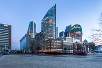 De skyline van Den Haag tijdens het invallen van de avond. Dit is het zicht vanaf het Koningin Julianaplein op de hoogbouw cluster.