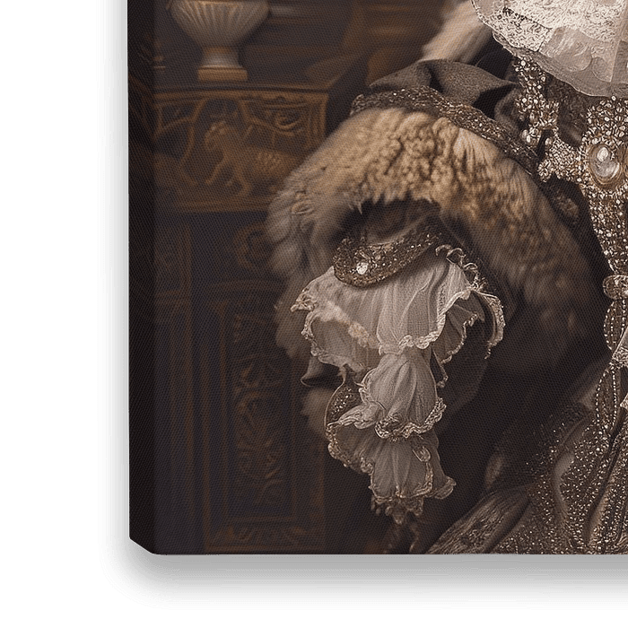 Dit indrukwekkende kunstwerk toont een schaap in koninklijke barokke kleding, gekroond met een prachtige tiara. De gedetailleerde afbeelding, van het weelderige kant tot de prachtige versieringen, benadrukt perfect de gratie en waardigheid van het dier. Ideaal voor kunstliefhebbers die een voorliefde hebben voor koninklijke motieven en…