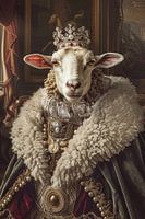 Dit indrukwekkende kunstwerk toont een schaap in koninklijke barokke kleding, gekroond met een prachtige tiara. De gedetailleerde afbeelding, van het weelderige kant tot de prachtige versieringen, benadrukt perfect de gratie en waardigheid van het dier. Ideaal voor kunstliefhebbers die een voorliefde hebben voor koninklijke motieven en barokke esthetiek en een elegante en verfijnde sfeer willen creëren in hun woonruimte.