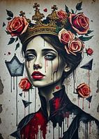 Koop dit portret Koningin met rozen en druipende verf van MIROKKU op canvas, aluminium dibond, (ingelijste) fotoprint, behang en ArtFrame, op maat geprint in Fine-Art kwaliteit.