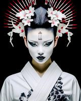 Dit indrukwekkende beeld toont een mysterieuze geisha die een bijna bovennatuurlijke uitstraling uitstraalt door haar vlekkeloze, albastkleurige huid en de heldere, zwarte lijnen van haar gezicht. Haar ogen zijn diep en doordringend, bijna hypnotiserend, en steken scherp af tegen het intense wit van haar gezicht. De ingewikkelde versieringen die haar haar sieren bestaan uit ingewikkeld ontworpen bloemen en piekerige rode accenten die in alle richtingen stralen en een visuele symfonie van gratie en kracht creëren.
