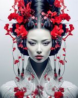 Haar ogen stralen een diepe kalmte uit die zowel emotionele afstand als een geheimzinnige innerlijke kracht weerspiegelt. Haar lippen zijn subtiel, bijna gereserveerd, in een zachtroze kleur die het gezicht een koele, etherische uitdrukking geeft. De symmetrische lijnen van de haarversiering benadrukken de vlekkeloze, geometrische precisie van haar verschijning, terwijl de heldere rode tinten van de bloemen het beeld vullen met levendigheid.