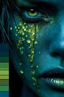 Een fascinerende interpretatie van mythische zeedieren wordt gepresenteerd in dit visionaire kunstwerk. De afgebeelde figuur lijkt tussen verschillende werelden te lopen - half mens, half zeewezen. De huid glanst met een metaalachtige glans, alsof hij nat is geworden door zout zeewater, terwijl gouden druppels als vloeibaar licht over het gezicht rollen.