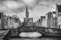 Een mooi zwart-witbeeld genomen vanop de Spinolarei van de Koningsbrug met op de achtergrond het Jan van Eyckplein en de Poortersloge (Burgher's Lodge), geflankeerd door de prachtige Middeleeuwse trapgevelhuisjes.