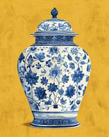Dit rustgevende, trendy kunstwerk is een porseleinen pot met een levendig en gedetailleerd blauwwit bloemenpatroon tegen een gele achtergrond, wat een frisse en vrolijke uitstraling geeft.