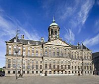 Het Koninklijk Paleis op de Dam in Amsterdam op een zonnige dag met een blauwe lucht en dramatische wolken.