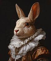 Een majestueus konijn, gekleed in een weelderig kostuum en een elegante kraag, straalt een verrassende charme uit en daagt de grenzen van de verbeelding en de kunst uit.