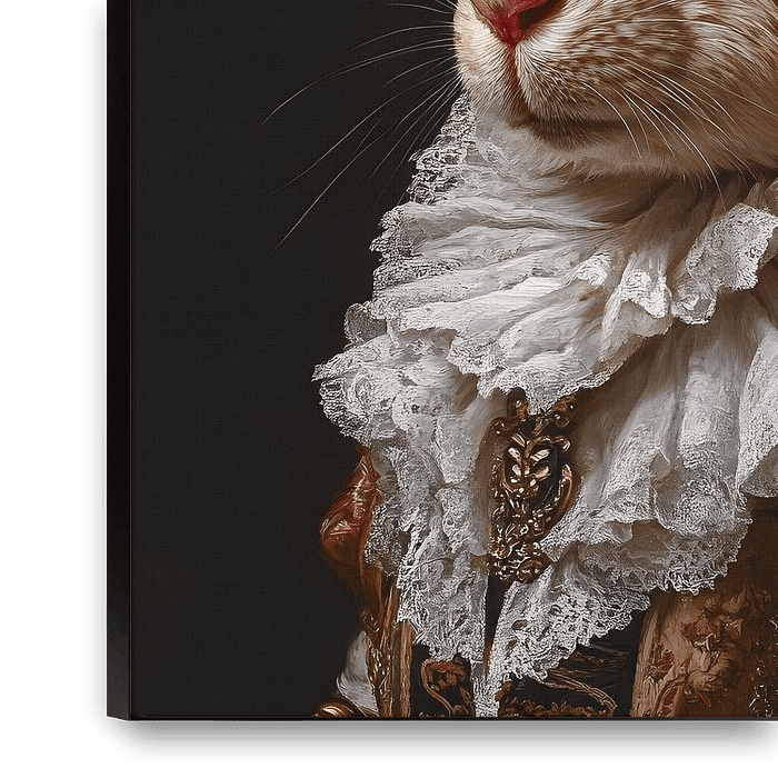 Een majestueus konijn, gekleed in een weelderig kostuum en een elegante kraag, straalt een verrassende charme uit en daagt de grenzen van de verbeelding en de kunst uit.