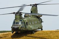 Een CH-47D Chinook van de Koninklijke Luchtmacht landt op een heuveltje op vliegbasis Gilze-Rijen.