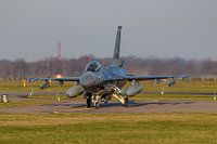 General Dynamics F-16 Fighting Falcon van de Koninklijke Luchtmacht vlak voor het vertrek voor een trainingsvlucht vanaf vliegbasis Volkel.